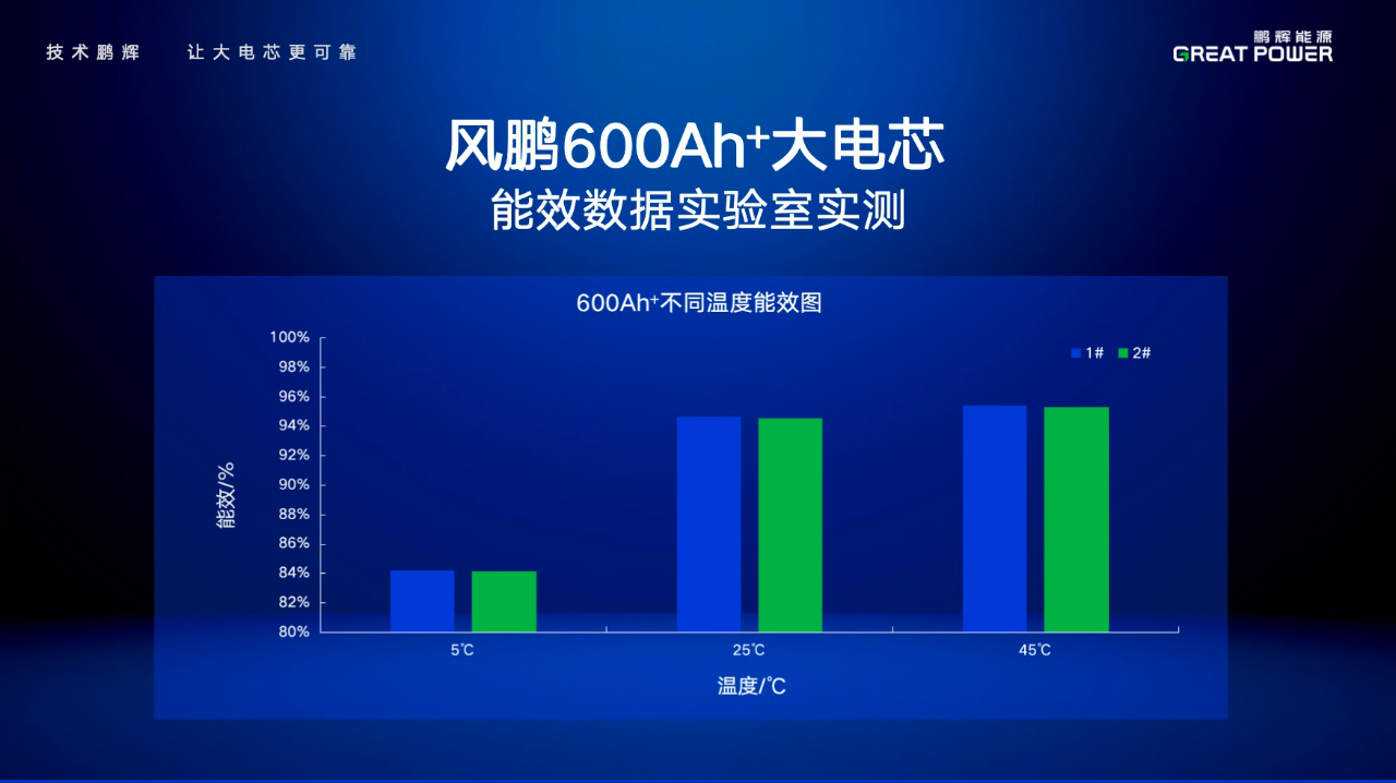 根據(jù)實(shí)驗(yàn)室實(shí)測數(shù)據(jù),目前階段風(fēng)鵬600Ah+大電芯已實(shí)現(xiàn)全溫域高能效,在5℃時,能效超84%;25℃時,能效超94.5%;45℃時,能效接近96%。同時,隨著研發(fā)體系持續(xù)迭代,風(fēng)鵬大電芯能效數(shù)據(jù)有望持續(xù)躍升。