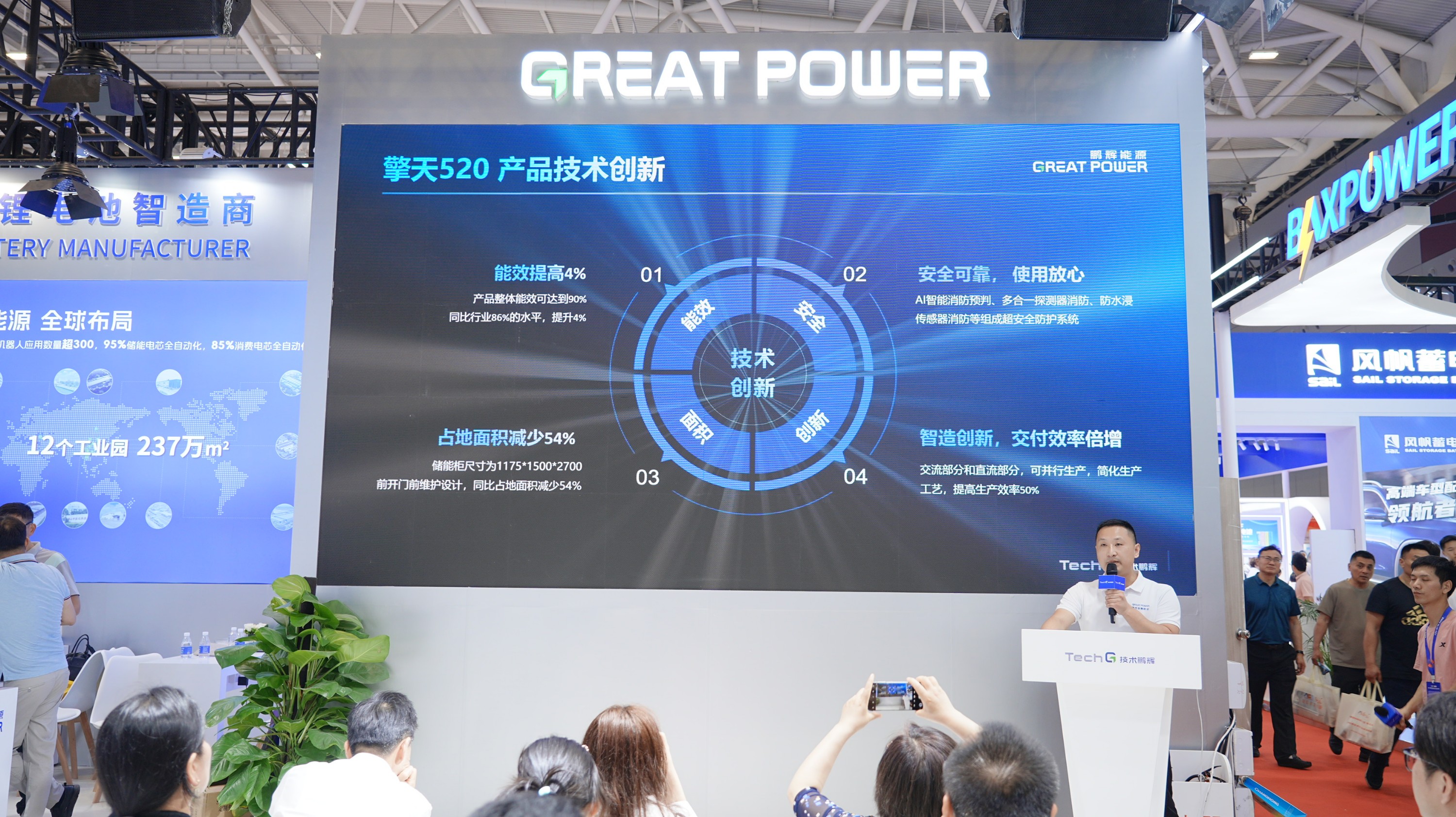 鵬輝智慧能源,則從安全、經(jīng)濟(jì)、運(yùn)維方面出發(fā),帶來了一場(chǎng)關(guān)于擎天520戶外液冷儲(chǔ)能柜的精彩報(bào)告。作為公司2025年重要工商業(yè)儲(chǔ)能產(chǎn)品,“擎天520”能效提升4%,占地面積減少54%,交付效率倍增,是一款將智慧能源與新型電網(wǎng)服務(wù)相結(jié)合的硬核新品。